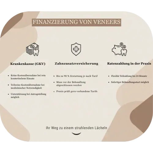 Nur bei klarer Indikation kann die Krankenkasse einen Zuschuss geben; meist gelten Veneers als kosmetisch. Prüfen Sie deshalb Zusatzversicherungen, um mögliche Maliyetler zu reduzieren.