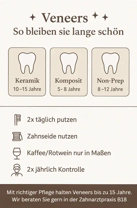 Veneers haben in der Regel eine Haltbarkeit von zehn bis fünfzehn Jahren. Mit guter Mundhygiene, angepasster Ernährung und halbjährlichen Kontrollen bleiben Veneers häufig deutlich länger schön. Unser Team zeigt Ihnen, wie Sie die Haltbarkeit maximieren. Buchen Sie noch heute Ihren Kontrolltermin in der Zahnarztpraxis B18 – Zahnarzt Wilmersdorf.